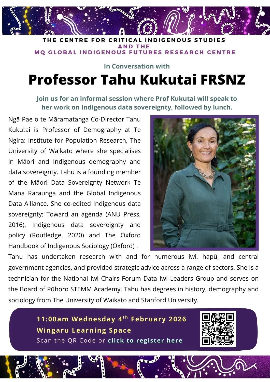 Prefix is run by the Centre for Global Indigenous Futures and the Department of Critical Indigenous Studies on Wallumattagal Campus (Macquarie University). It will run from 9.30am to 4pm on Monday 25 November, at 25 Wally's Walk room C122 Exhibition Space.